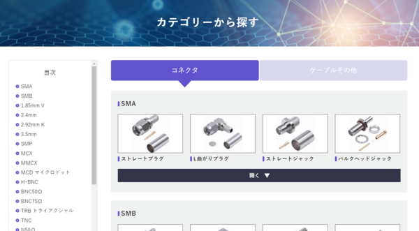 SMA/BNCなどのカテゴリーから、プラグ/ジャックなどの形状ごとに、製品一覧へと遷移するページになっております。